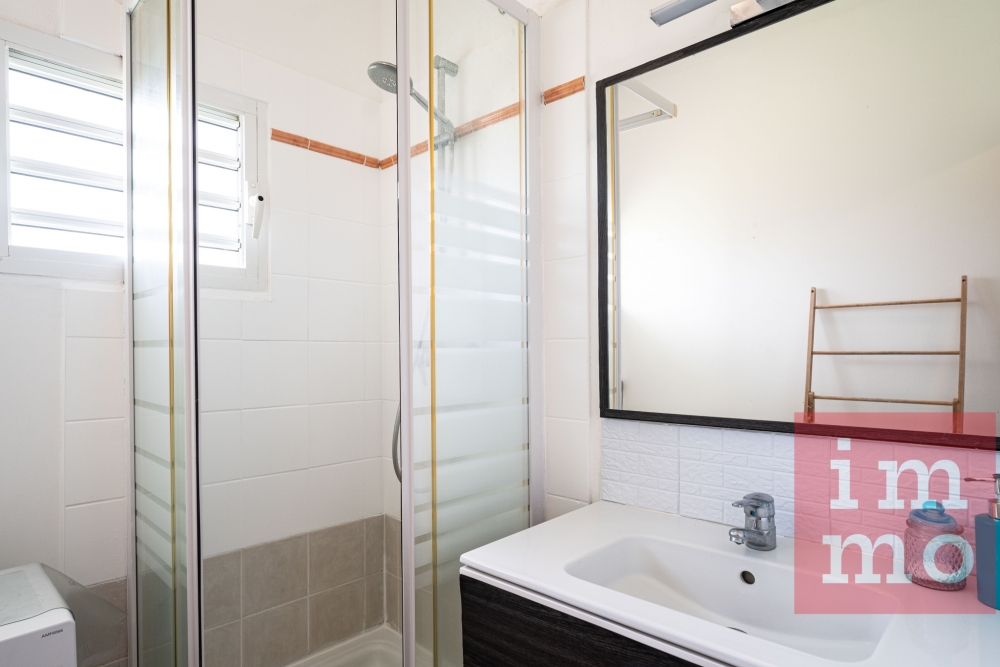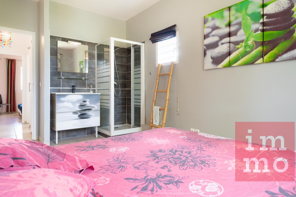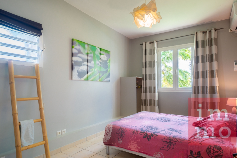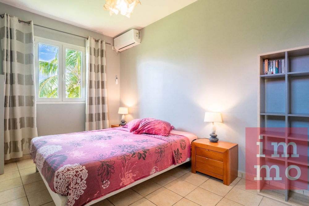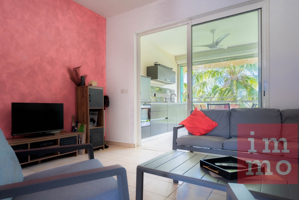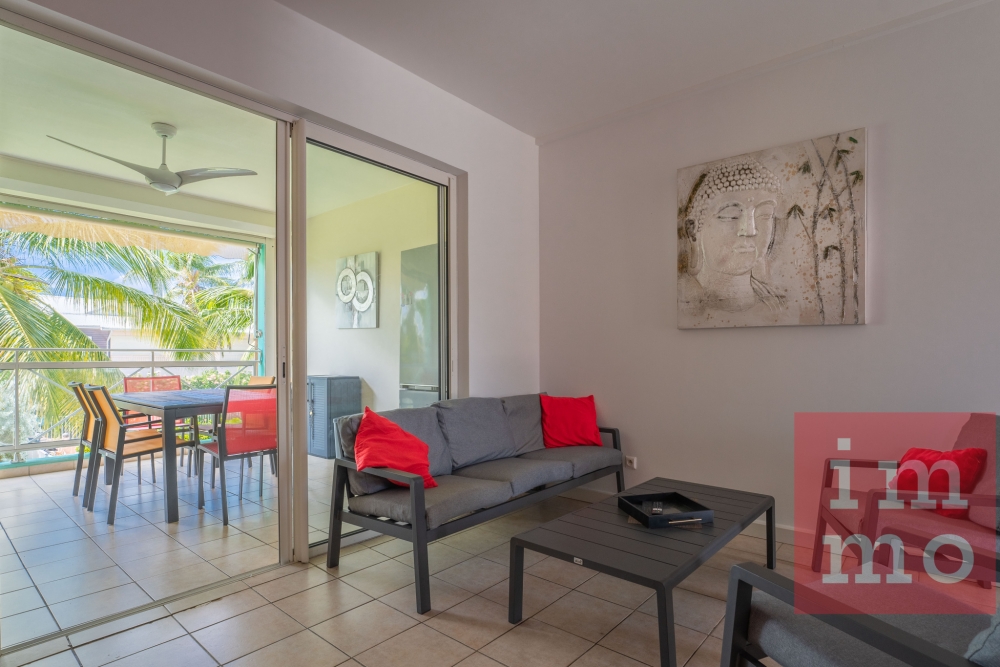 Le séjour lumineux offre un espace de vie convivial et fonctionnel. La cuisine aménagée, installée sur la terrasse couverte, permet de profiter de l’extérieur tout au long de l’année dans une ambiance tropicale.