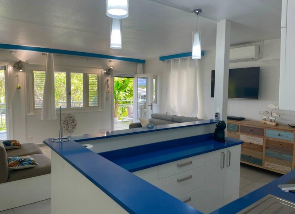 Pièce principale avec cuisine américaine aménagée et équipée