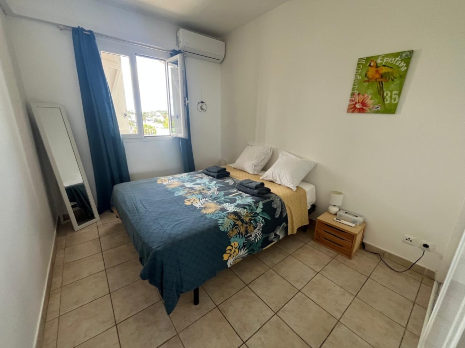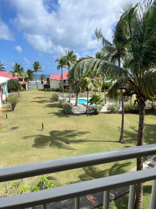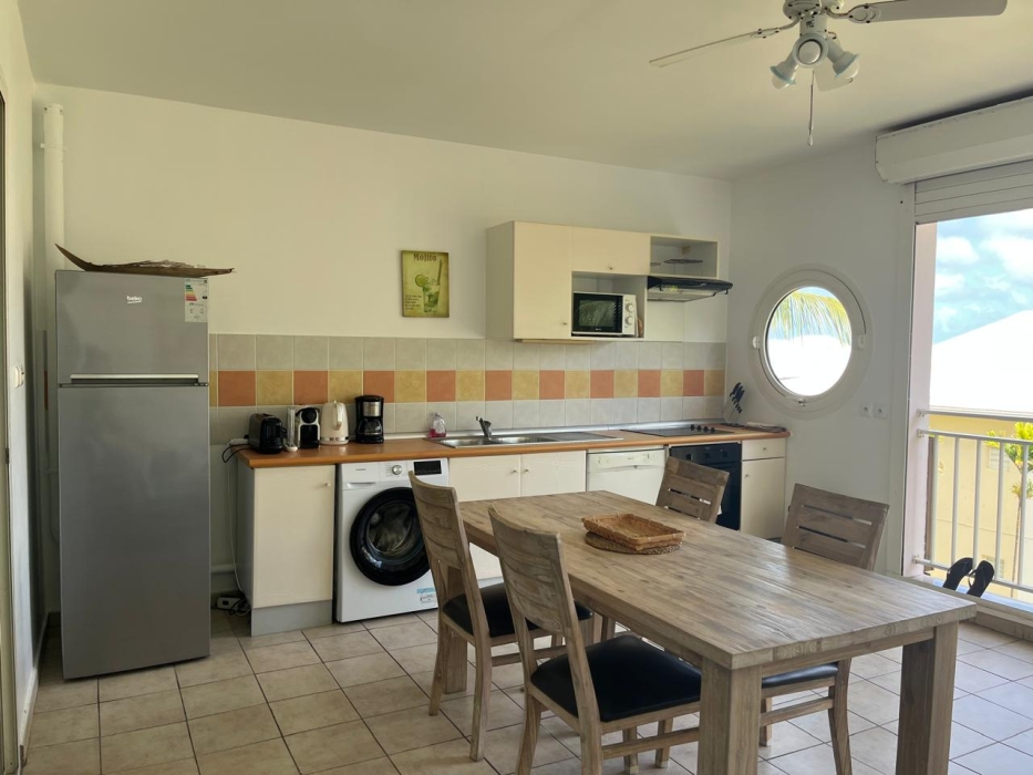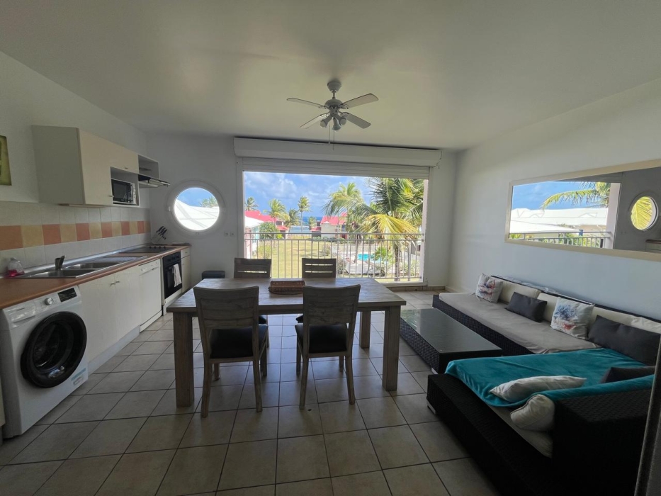 Idéalement situé à Saint-François, dans une résidence de standing sécurisée avec pisicines et accès mer, bel appartement type 2 d'une surface totale de 67.83 m2 comprenant : une entrée, un séjour avec rangement, une chambre, une cuisine sur véranda, une salle d'eau, WC