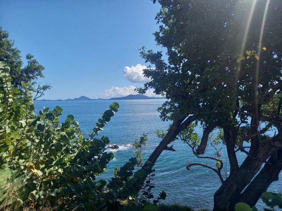 De larges baies vitrées offrant une vue dégagée sur la mer et les Saintes.
