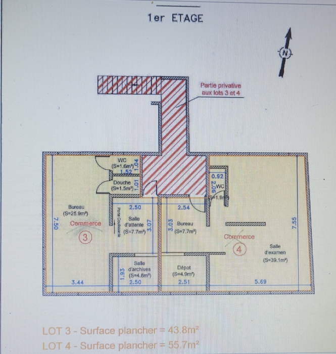 Il se compose d'une pièce principale de 39.1M2, d'un bureau de 7.7M2, d'un dépôt de 2.5M2, d'un WC de 2M2.