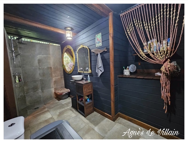 Au bord d'une ravine ornée de superbes roches noires, le terrain de plus de 2 900 m² en zone agricole est un véritable jardin vivant : arbres fruitiers en abondance (avocatiers, bananiers, cocotiers, manguiers, papayers, cacao, café, corossols, Vanille…), fleurs tropicales et ombres apaisantes de la forêt environnante.