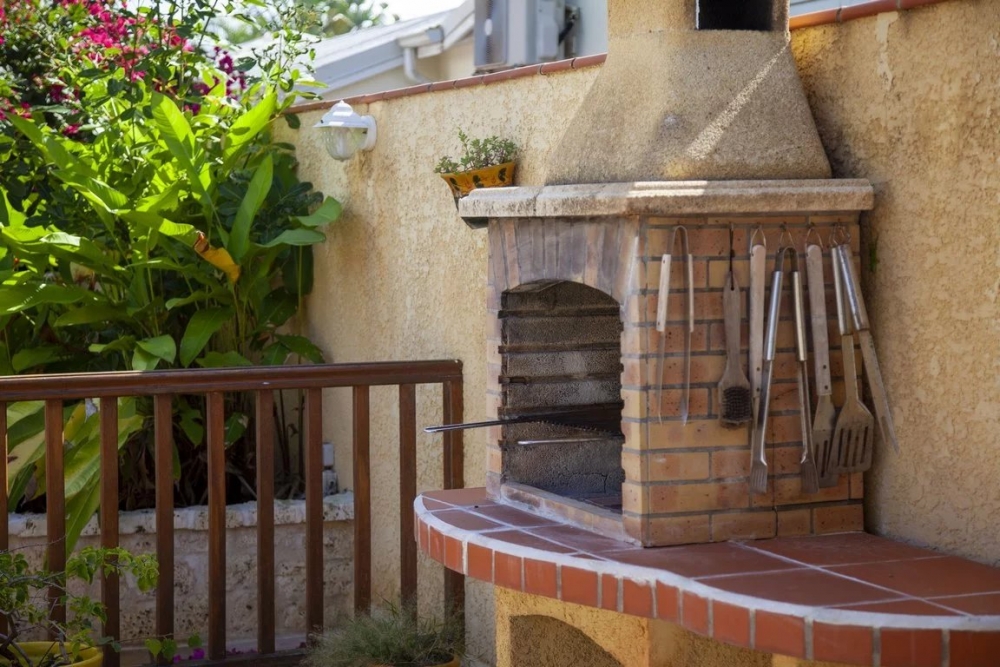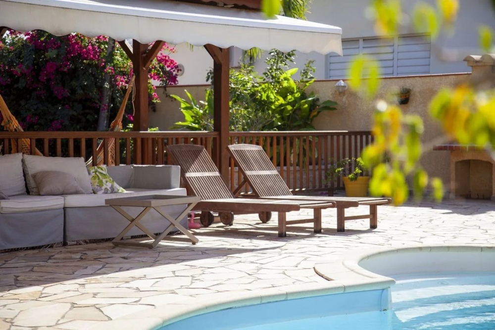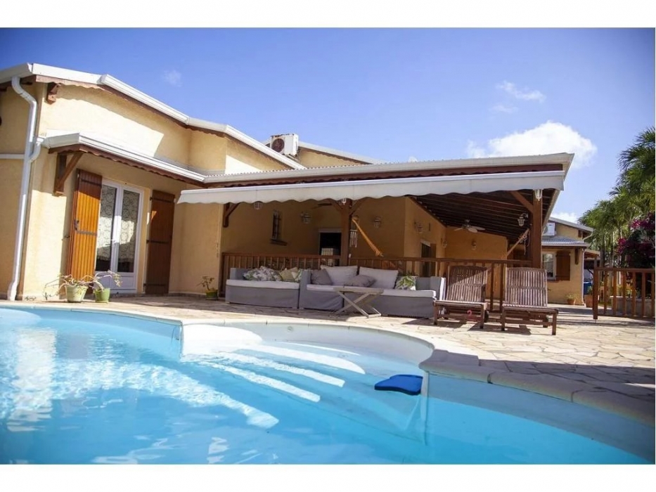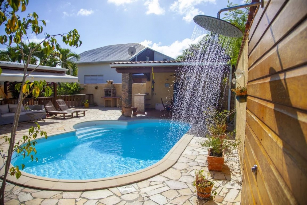 Grande terrasse couverte, une piscine avec douche extérieure, plage de piscine en pierre de bavière, carbet, barbecue, bassin d'agrément, salle de sport climatisée, 1 wc d'extérieur, garage pour deux voitures + abri voiture, portail automatique,