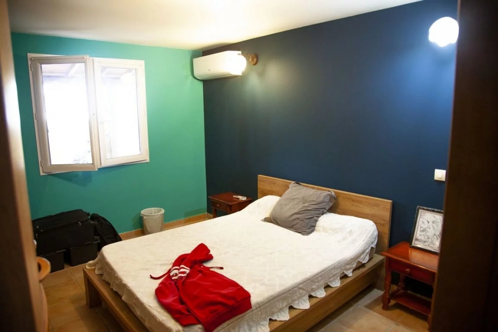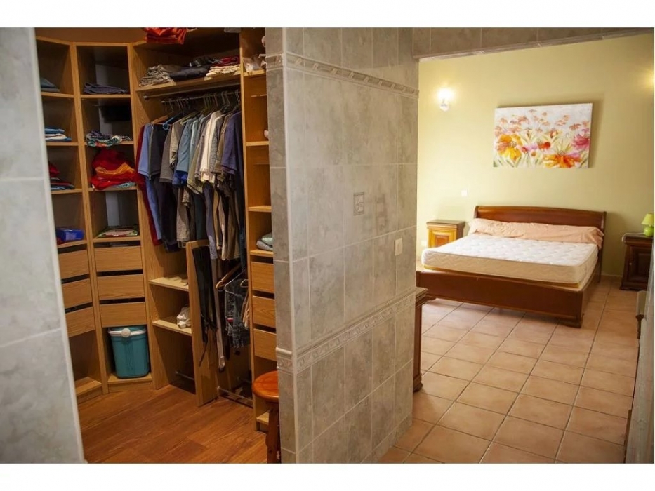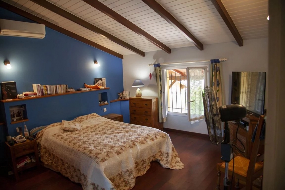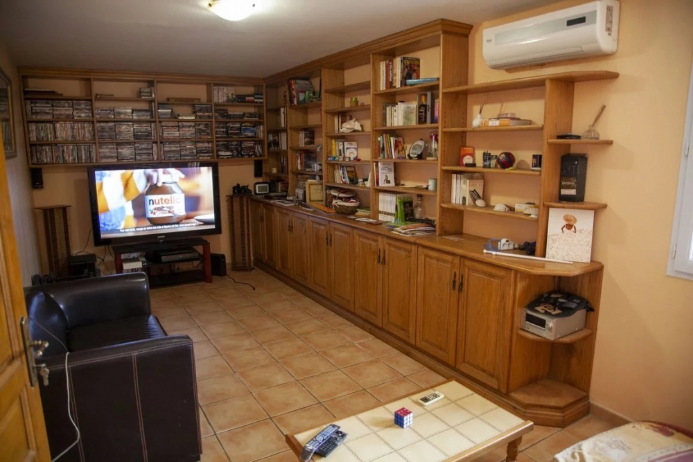 une cuisine semi-équipée avec lave -vaisselle, micro-ondes, piano à induction avec deux fours, aménagée avec beaucoup de rangements et ilôt central, cellier attenant, grand séjour avec belle charpente et hauteur sous plafond, climatisé avec portes fenêtres à galandage + volets roulants, une pièce bibliothèque et salon TV.