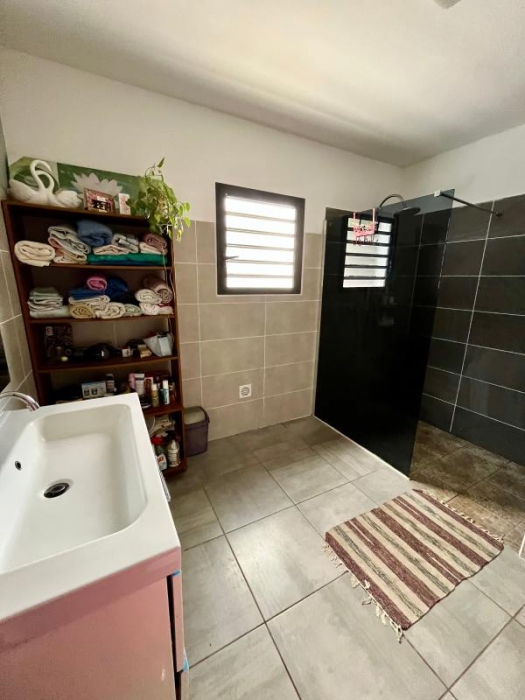 Cette villa offre 1 séjour lumineux avec une grande cuisine ouverte, une salle de bains avec douche à l'italienne, un W.C. séparé, 2 chambres, une grande varangue et jardin donnant sur la mer.