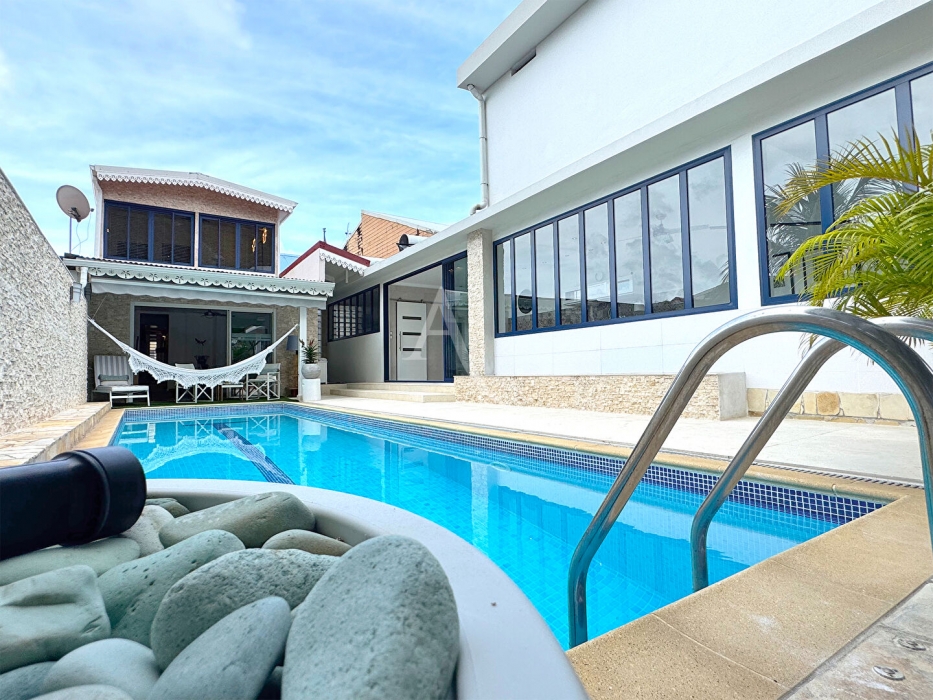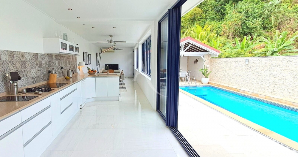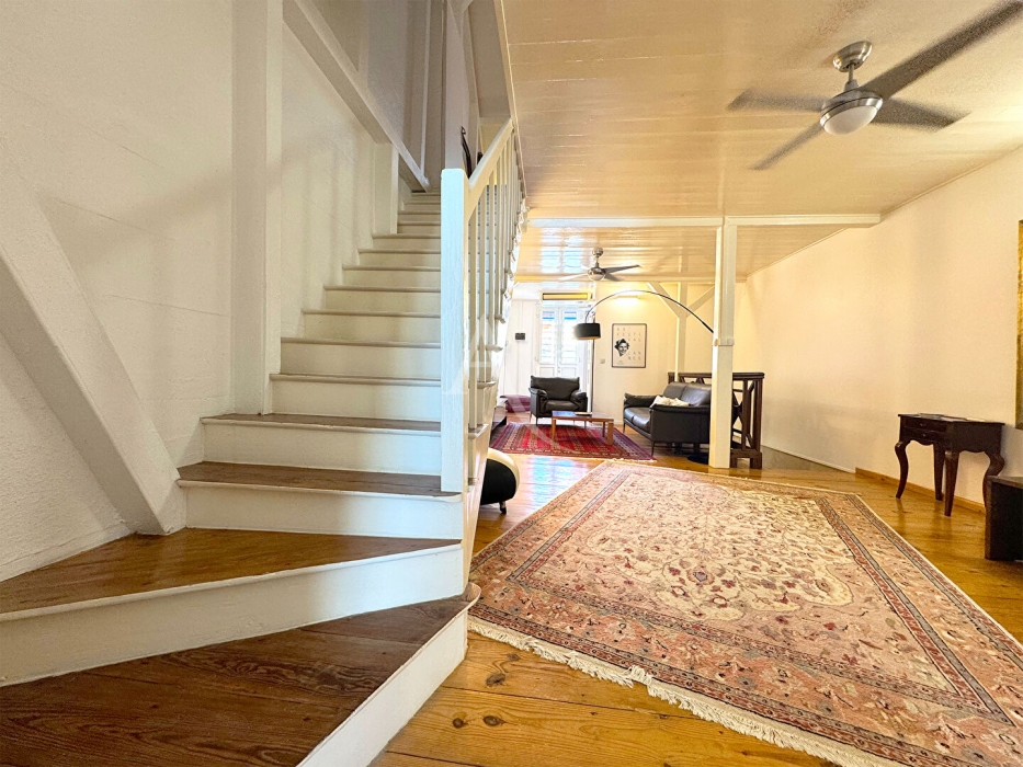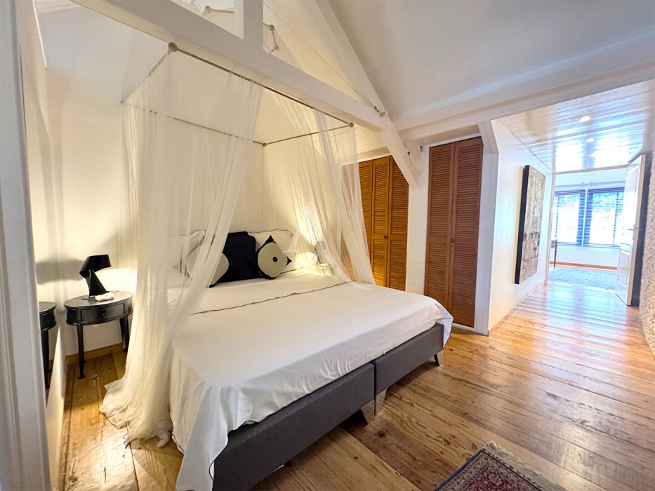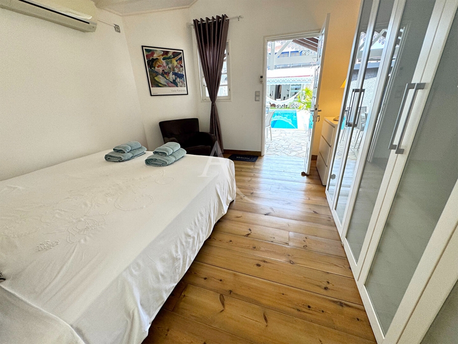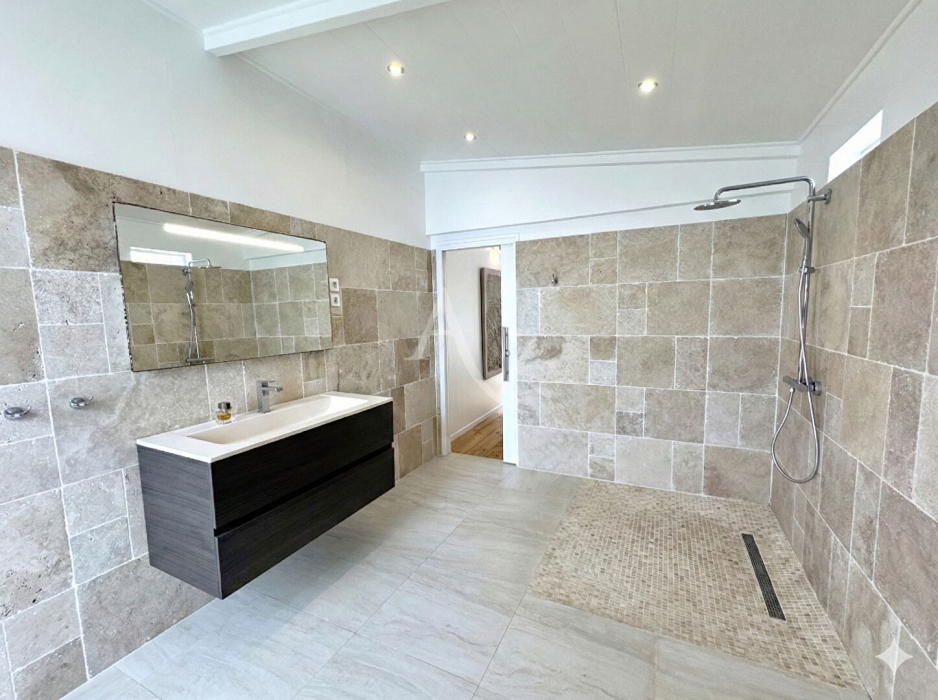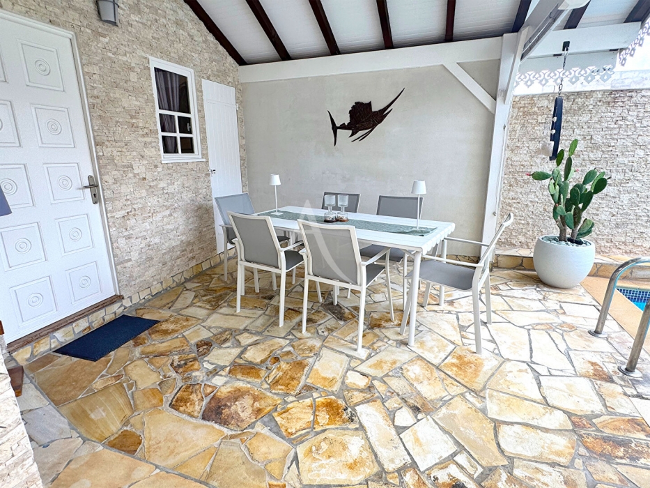 Située dans la commune prisée de La Trinité pour ses plages de surf et son authenticité, cette maison de ville contemporaine de 211 m² habitable se développant sur env. 382m2, offre une signature architecturale unique. Complètement rénovée en 2017 avec des matériaux d'exception, elle allie confort urbain et sérénité tropicale, à moins de 10 minutes à pied de la plage des Raisiniers. Espaces de vie et Réception : - Vaste séjour de 30 m² climatisé avec parquet en bois massif, - Salle de douche, dressing aménagé, armoires sur mesure, - Cuisine haut de gamme avec plans de travail en quartz, cellier, salle à manger et 2nd salon d'été sous une majestueuse verrière en aluminium bleu saphir. Suites et Intimité : - Trois suites parentales climatisées, dont une suite de 23 m² avec vue panoramique sur la nature, - Bureau climatisé de 16 m² ou 4ème chambre, - Salle de sport. Extérieurs et Détente : - Piscine au sel de 10m x 3m et multiples terrasses couvertes avec vues dégagées, - Jardin arboré orienté Ouest, véritable écrin de verdure. Rez-de-chaussée et Potentiel : - Local professionnel de 43 m² (actuellement profession libérale) avec WC et buanderie. - Garage fermé et local de 87 m² offrant de larges possibilités d'aménagement. Prestations clés : - Matériaux nobles (quartz, travertin, aluminium). - Usage : Résidence de prestige, profession libérale et/ou investissement locatif de standing. - Situation : Central, plages et commodités à pied, calme absolu. Une propriété rare aux prestations soignées destinée à une clientèle unique.