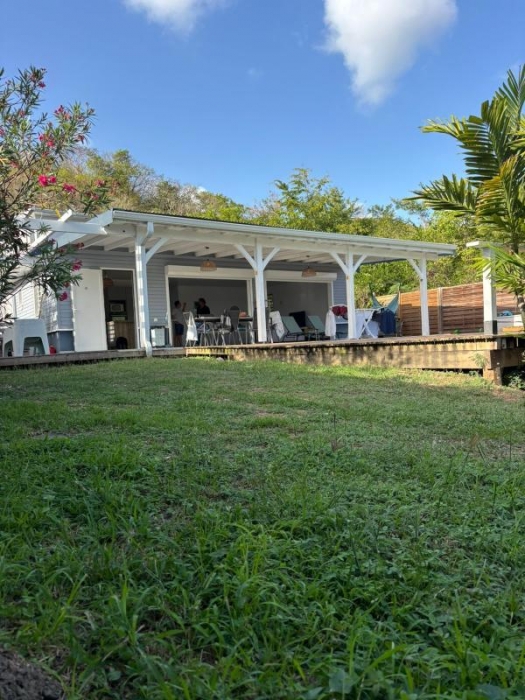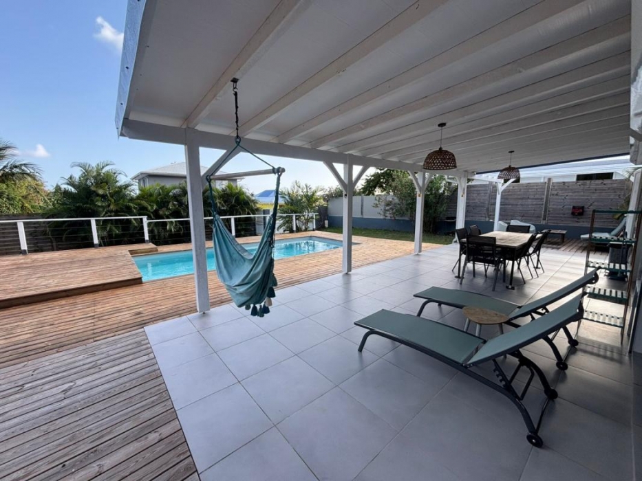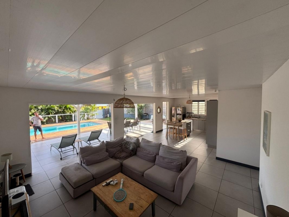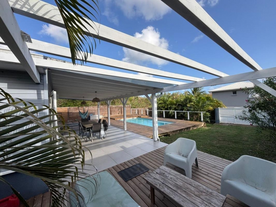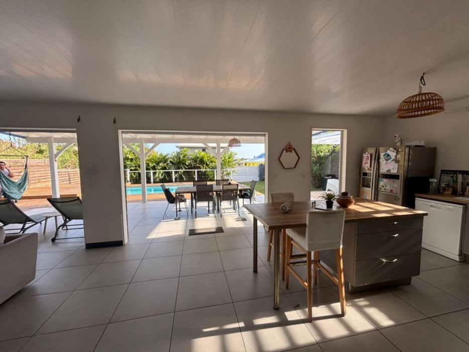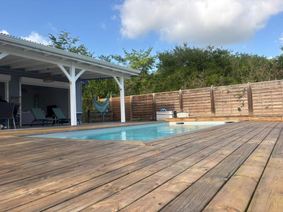 Implantée sur un terrain plat entièrement clôturé, la propriété bénéficie d'un portail et d'un extérieur parfaitement aménagé comprenant une piscine au sel 7X3,5 m, un deck en bois de plus de 40 m2 et une pergola de 12m2, idéals pour profiter pleinement du climat tropical.