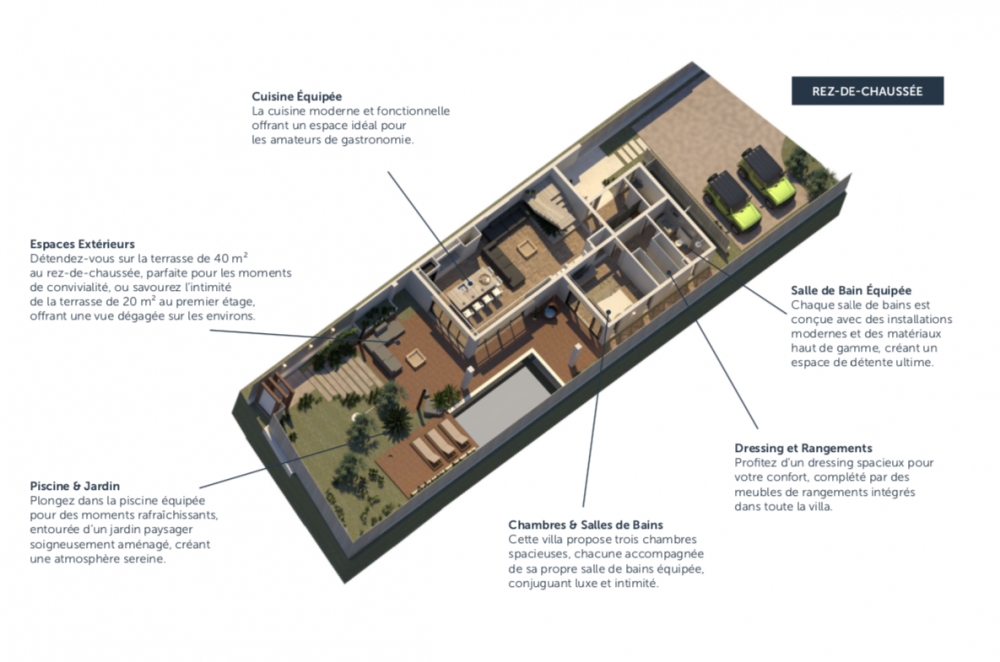- au rez-de-chaussée: un séjour avec une cuisine équipée ouverte, une chambre avec un dressing, une salle de bain attenante et un wc. La terrasse de 40m2 est parfaite pour les moments de convivialité, donne sur une piscine au sel.