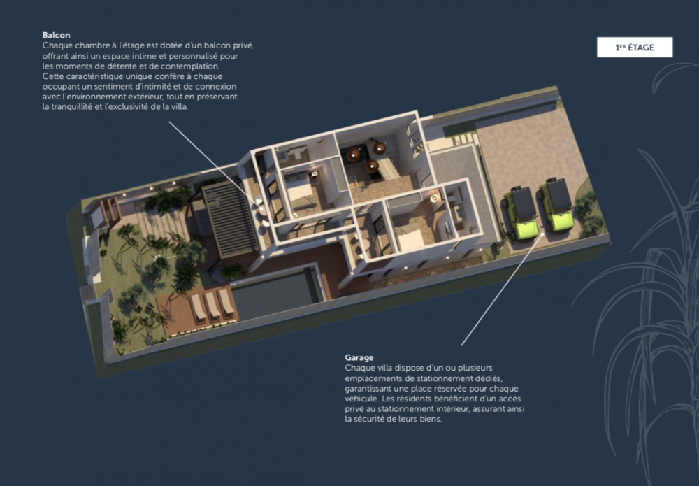 - à l'étage: deux chambres dotées d'un balcon privé, deux salles de bain.