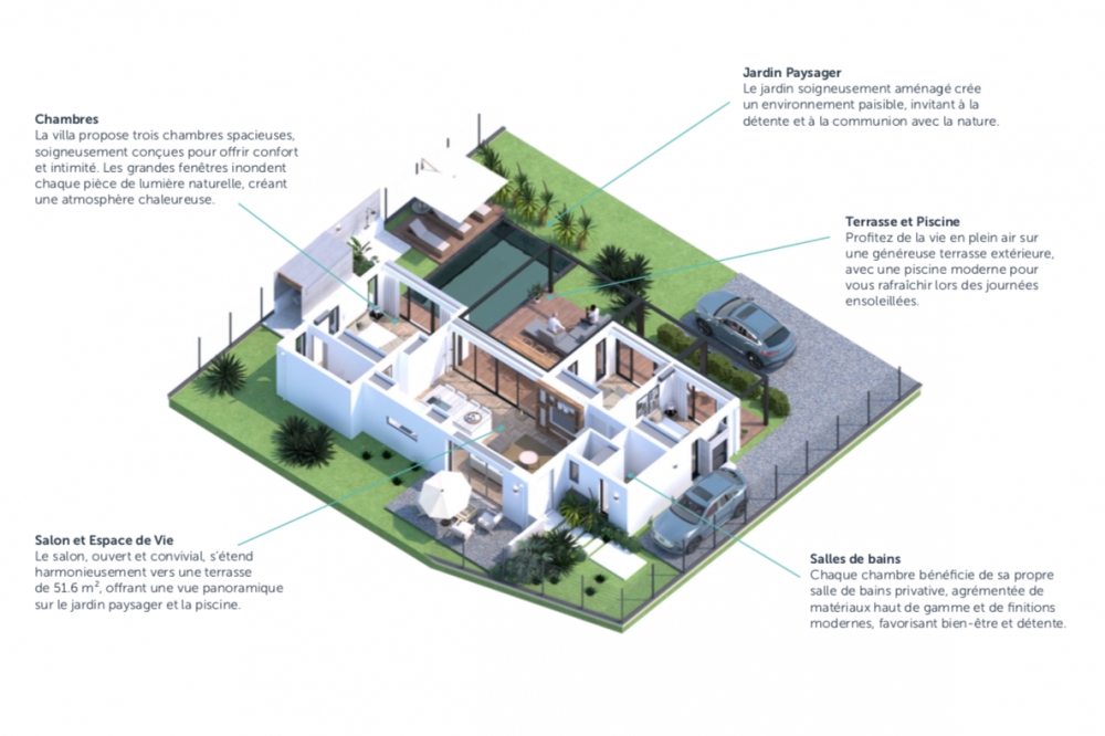 - un séjour ouvert et convivial avec une cuisine aménagée donne sur une terrasse de 51 m2, offrant une vue panoramique sur un jardin paysagé et une piscine au sel, invitant à la détente.