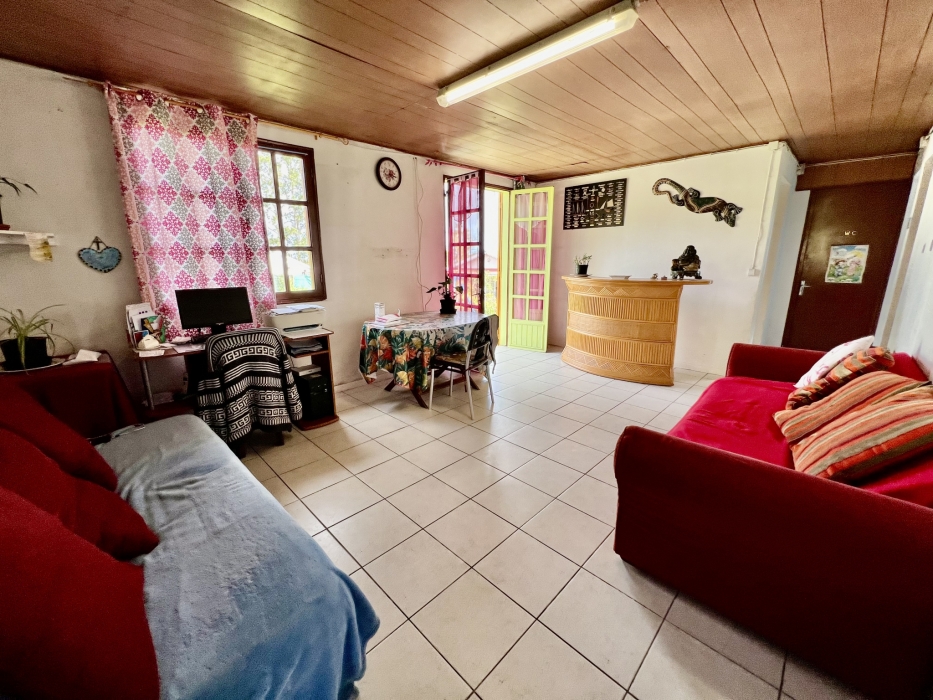 TAMPON 97430 - À proximité des établissements scolaires, venez visiter cette maison de type T2/3 de plain-pied, de 106 m2 habitables. Nichée au sein d'une parcelle plate et arborée de 750 m2 dont 530 m2 clôturé. Côté jour, profitez d'une pièce de vie de 21 m2 comprenant un séjour convivial et d'une salle à manger spacieuse, ainsi qu'une vaste cuisine de 15 m2. Le côté nuit, se compose de 2 chambres, d'une mezzanine, d'une salle de bains fonctionnelle et d'un WC. Une pièce de type atelier de 13 m2 est également à votre disposition. À l'extérieur, bénéficiez d'une belle varangue de 25 m2, d'un abri de voiture couvert et d'un grand espace jardin. Travaux de rafraîchissement à prévoir. Située dans un environnement paisible et bucolique.