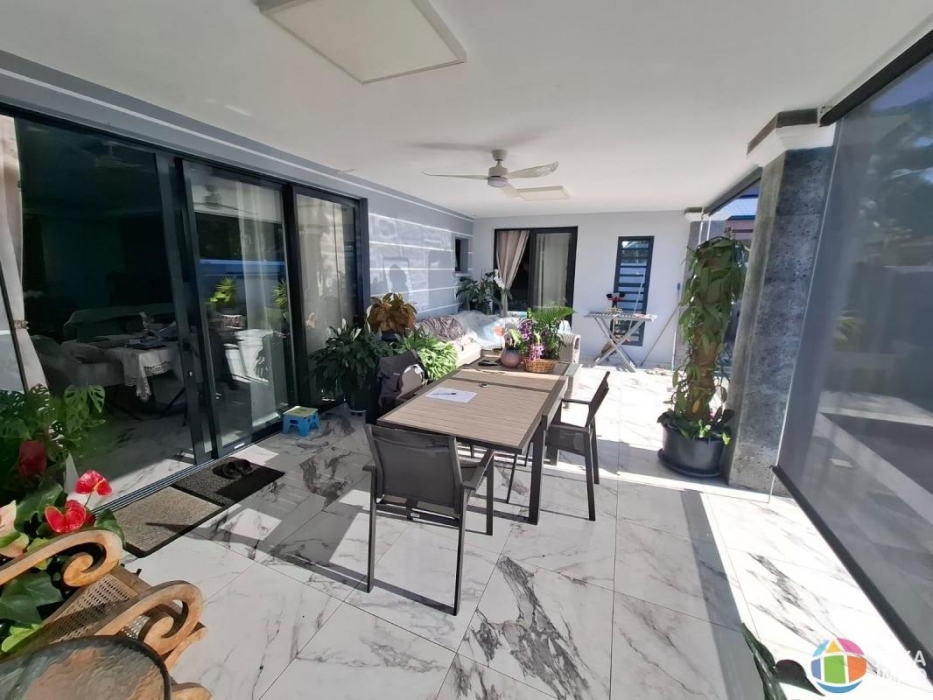 Un extérieur conçu pour profiter du climat tropical. Le terrain plat et clos entoure harmonieusement la maison. Une terrasse couverte crée une parfaite transition entre intérieur et jardin.