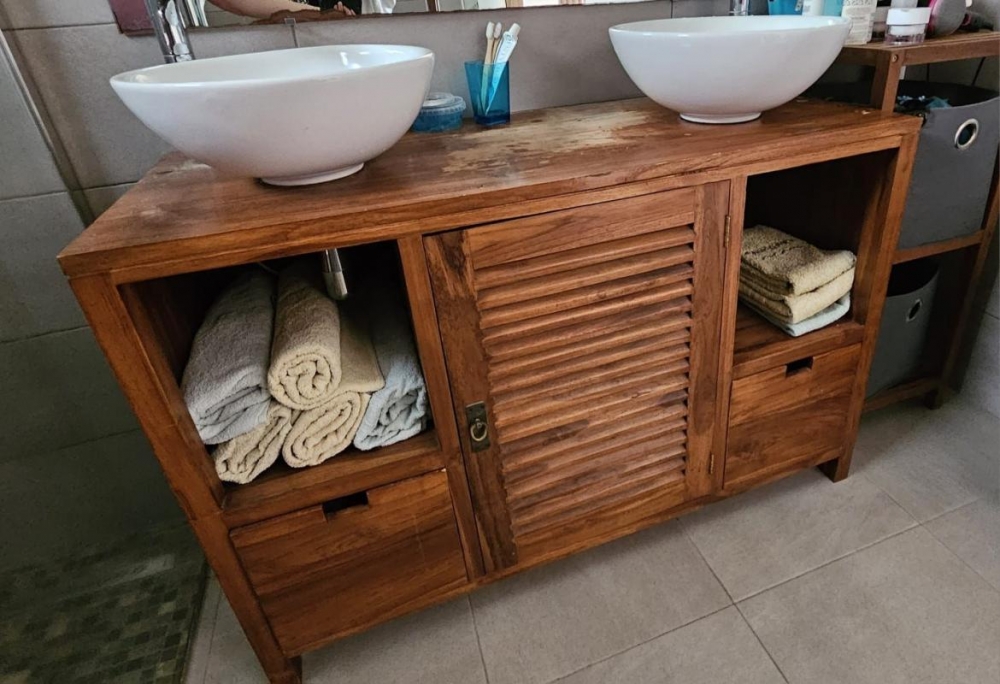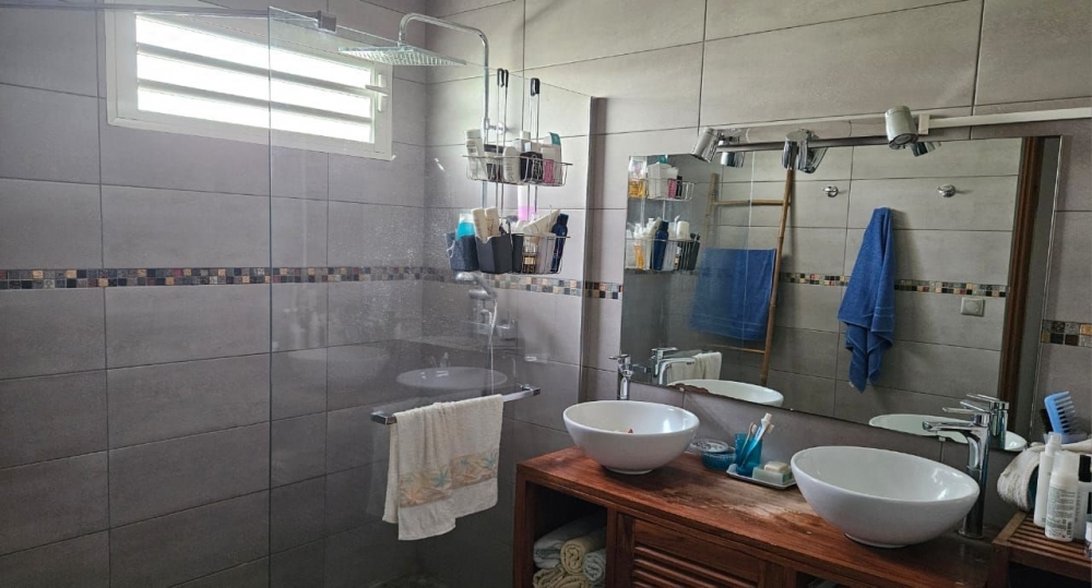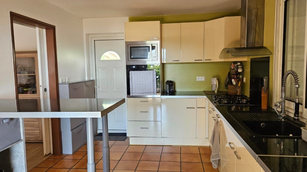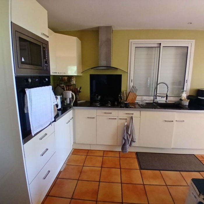 La villa se compose de 3 chambres dont 1 de plus de 14 m² climatisée et 2 avec grands placards sur mesure, une grande cuisine de 14 m² donnant sur la terrasse et le jardin, un salon ouvert sur la salle à manger de plus de 30 m², un dégagement, une salle d'eau avec douche à l'italienne et meuble double vasque en teck, WC suspendu séparé.