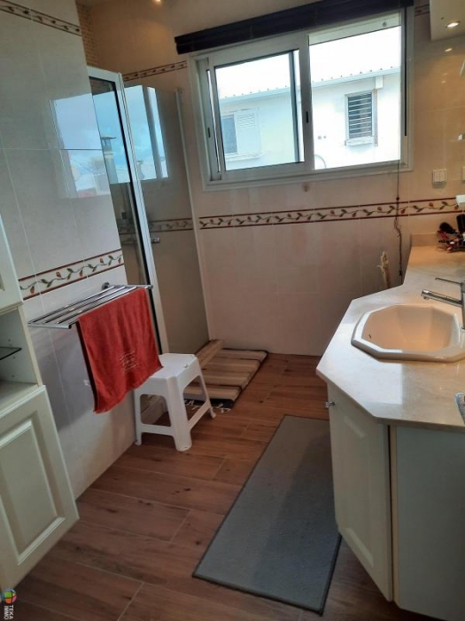 Salle de bain avec douche italienne, WC et garage fermé, buanderie et véranda . A l'étage (comble) séjour de 43.7m² avec cuisine