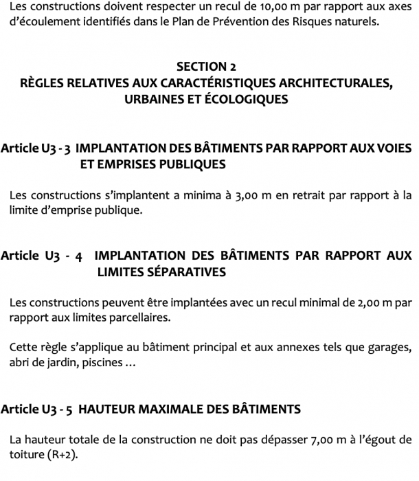 Classé en zone U3 du Plan Local d’Urbanisme, ce terrain permet la réalisation de divers projets immobiliers : construction résidentielle, activité commerciale ou artisanale, dans une logique de mixité favorisant le dynamisme du secteur et limitant les déplacements vers le centre-ville.
